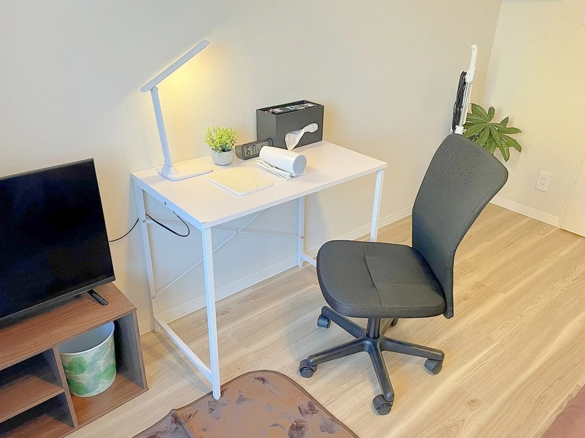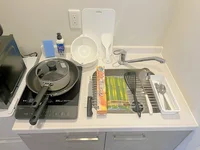 座椅子・全身鏡・TVボード・リモコン立て・卓上ミラー・食器類・調理器具類・食器用洗剤・食器用スポンジ・ハンガー・パラソルハンガー ・ダストボックス・ティッシュペーパー・靴ベラ・照明・デジタル時計・テレビアンテナケーブル・マットレス・バスマット・タオル(大・小) ・トイレットペーパー・トイレ用洗剤・バス用洗剤 ・シャンプー ・リンス・ ボディソープ ・トイレ用ブラシ ・トイレ用ダストボックス・ wifiルーター・ラグ