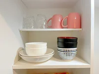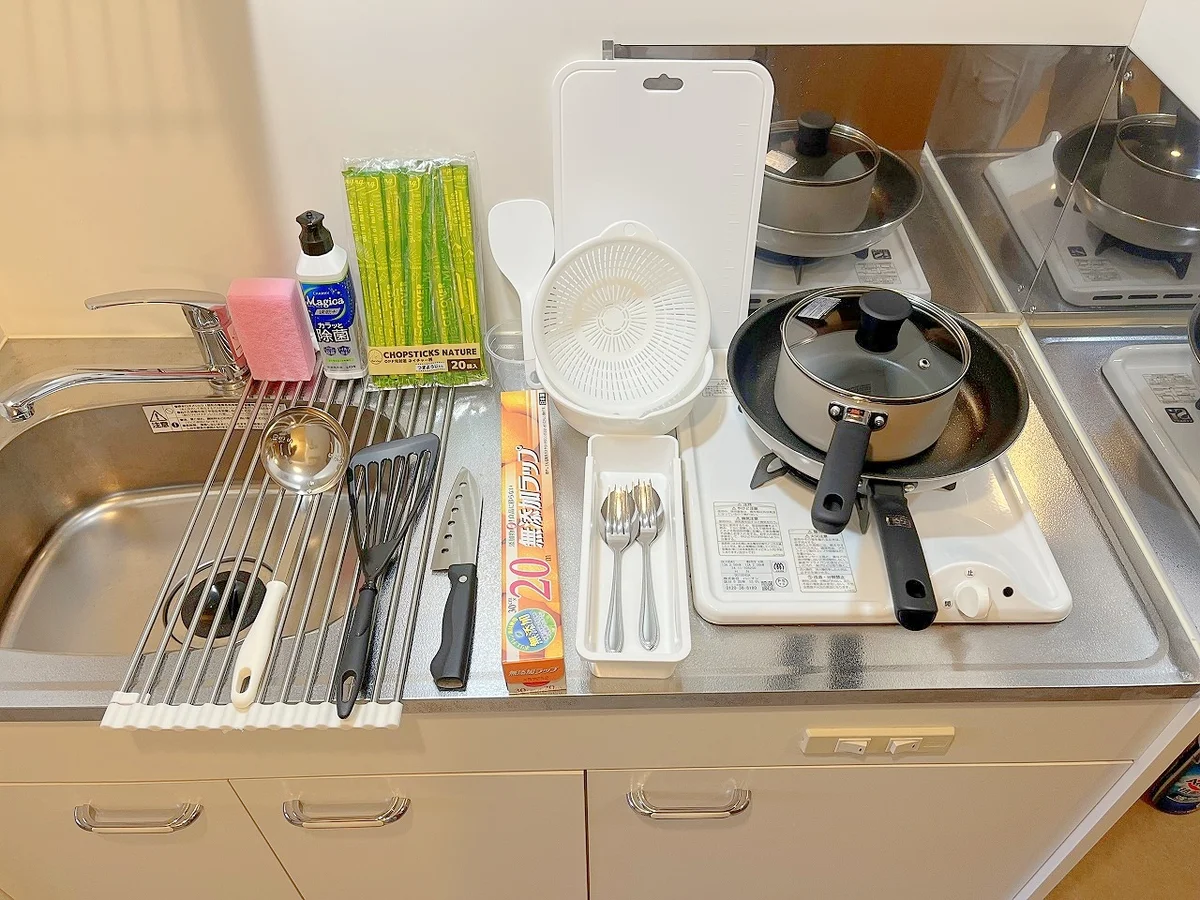 座椅子・全身鏡・TVボード・リモコン立て・卓上ミラー・食器類・調理器具類・食器用洗剤・食器用スポンジ・ハンガー・パラソルハンガー ・ダストボックス・ティッシュペーパー・靴ベラ・照明・デジタル時計・テレビアンテナケーブル・延長コード・マットレス・バスマット・タオル(大・小) ・トイレットペーパー・トイレ用洗剤・バス用洗剤 ・シャンプー ・リンス・ ボディソープ ・トイレ用ブラシ ・トイレ用ダストボックス・ wifiルーター・ラグ